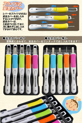 ◆スライド式安全カバー付き彫刻刀 ・スライド式安全カバー付きで、刃に触れずに安全に使用でき、もしもの時も安心です! ・お子様の上達度によって カバーの有無を選択いただけます。